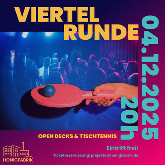 Packt eure Tischtenniskellen ein, kommt vorbei und spielt an zwei Platten Rundlauf mit uns. Das Ganze wird begleitet von mehreren DJs, welche einen bunten Genre Mix auflegen.