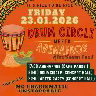 It’s nice to be nice – unter diesem Motto treffen sich Musik, Essen und Gemeinschaft in der Honigfabrik. Der Abend beginnt um 17 Uhr im Café Pause mit AbenAfro’s afro-veganem Essen. Ab 20 Uhr geht es im Konzertsaal weiter mit einem Drum Circle, bei dem Rhythmus, Energie und gemeinsames Erleben im Mittelpunkt stehen. Ab 22 Uhr verwandelt sich der Abend in eine After Party mit Yaxic B und Guest DJs, die mit Afrobeat, Reggae, Dancehall und Amapiano für tanzbare Vibes sorgen. Ein Abend voller Geschmack, Klang und guter Energie – come together and feel the rhythm.