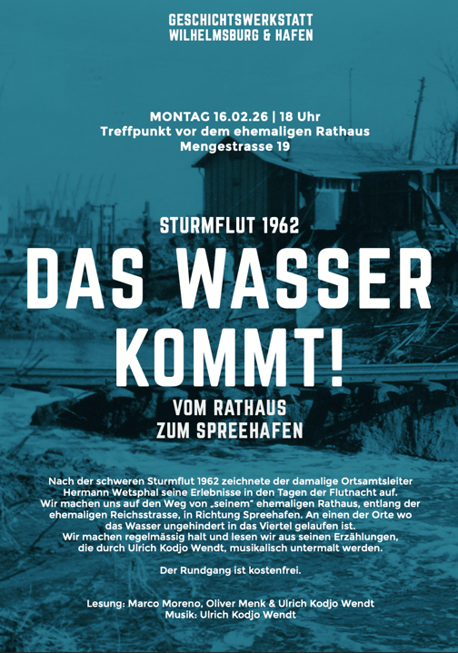 Nach der schweren Sturmflut 1962 zeichnete der damalige Ortsamtsleiter Hermann Wetsphal seine Erlebnisse in den Tagen der Flutnacht auf. Wir machen uns auf den Weg von „seinem“ ehemaligen Rathaus, entlang der ehemaligen Reichsstrasse, in Richtung Spreehafen. An einen der Orte wo das Wasser ungehindert in das Viertel gelaufen ist. Wir machen regelmässig halt und lesen wir aus seinen Erzählungen, die durch Ulrich Kodjo Wendt, musikalisch untermalt werden.