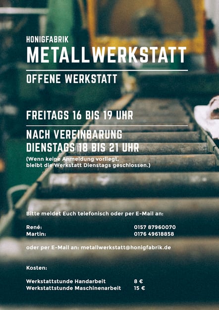 Die Metallwerkstatt wird ehrenamtlich geleitet von Martin und René. Ihr findet die Werkstatt im Hof der Honigfabrik.