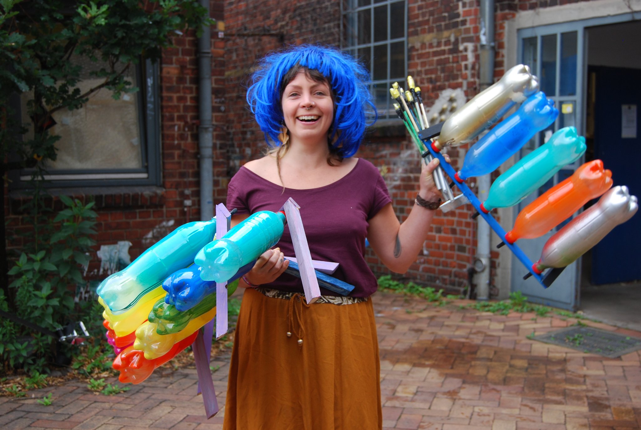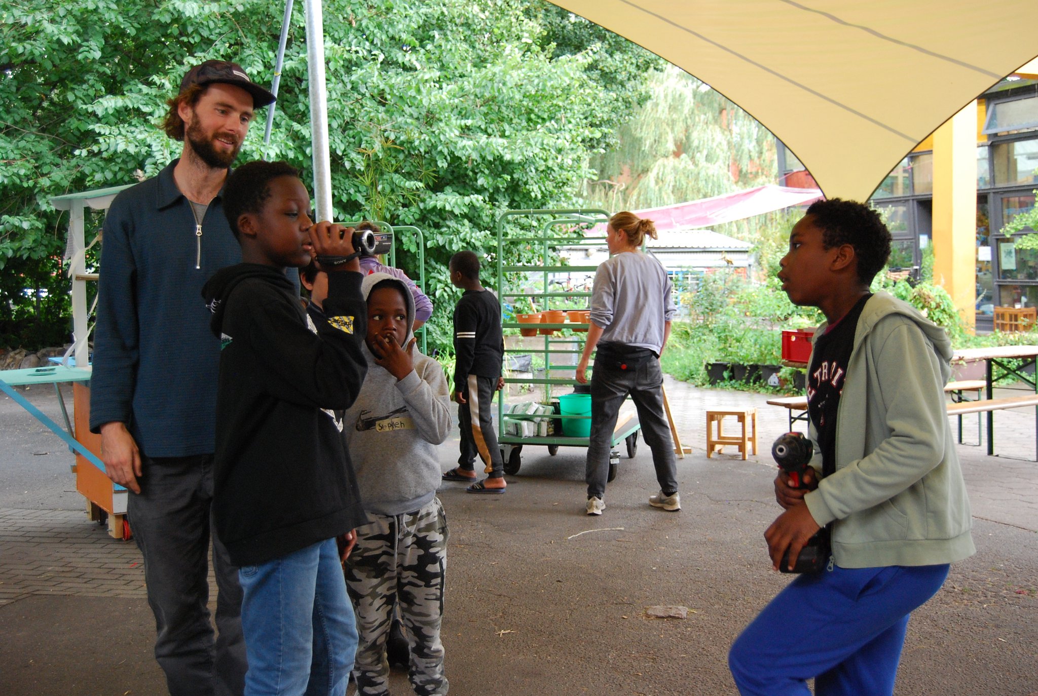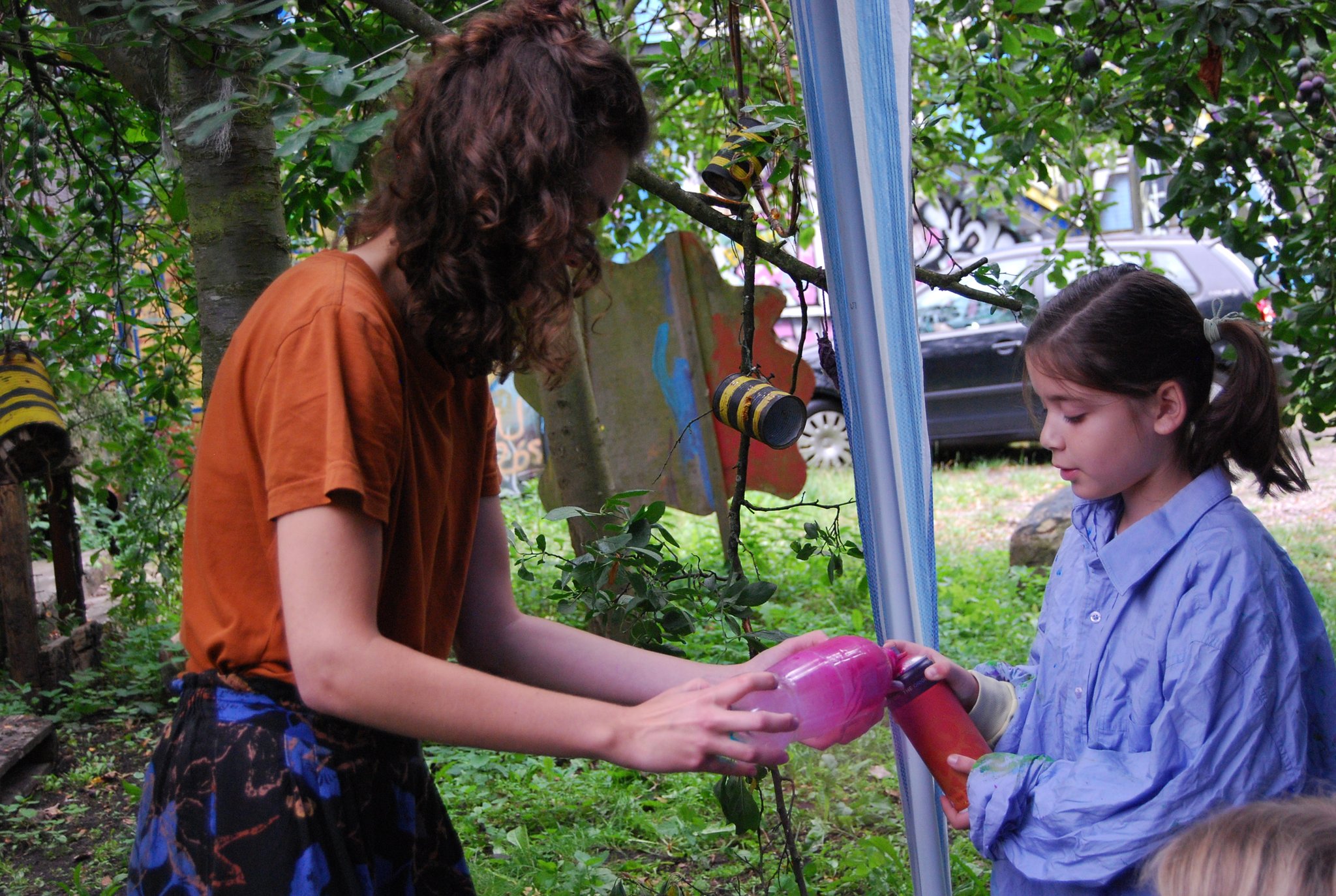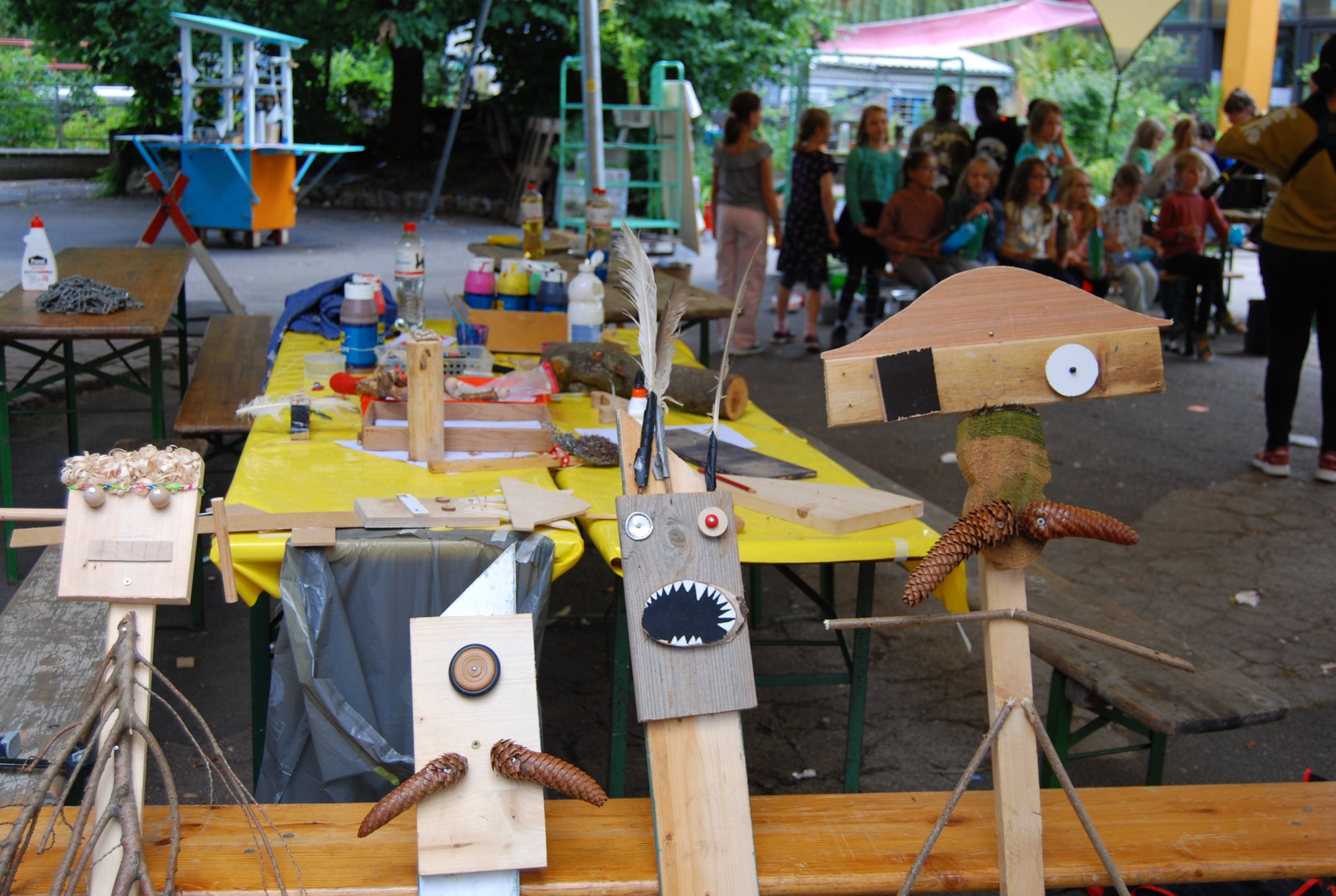 Das war mal eine bunte Sommerferien Kulturwoche im Hof! Es herrschte reges Treiben sobald man den Hof betrat. In der einen Ecke werkelten die Kinder an ihren Fantasiewesen, schraubten Hölzer aneinander geschraubt und malten rote Augen. In der anderen Ecke wurde mit Wasserfiltern experimentiert. Wer hat den besten Wasserfilter hergestellt? Wie wird das Wasser besonders sauber…? Und von vorne aus dem Garten erklang Musik, die auf den selbstgebauten Flairdrums gespielt wurde. Um den Schornstein herum wurden fleißig Loombänder geknüpft und Leuchtequallen hergestellt. Und das Ganze wurde von einen eifrigen Filmteam dokumentiert, welches immer und überall dabei war. Am Freitag kamen dann alle Freunde und Eltern, um die hergestellten Kunstwerke bei unserem Abschlussfest zu bestaunen.
