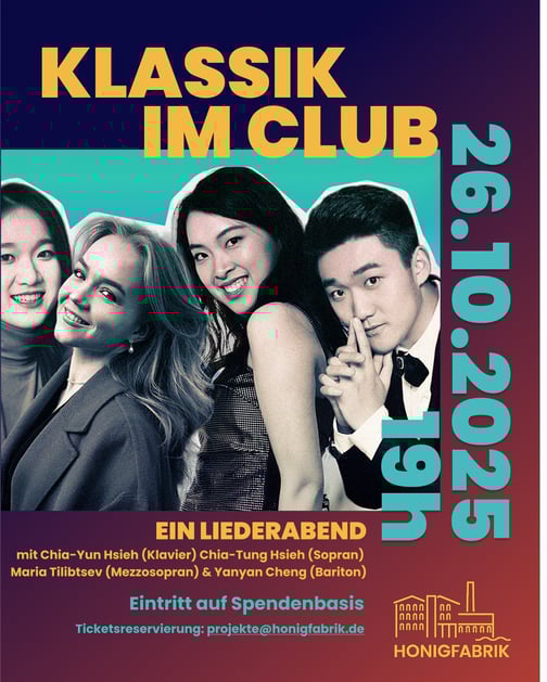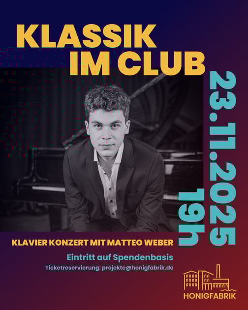 *Karten gibt es ausschließlich im Vorverkauf über die Honigfabrik. Bitte schickt hierfür eine Email an projekte@honigfabrik.de mit dem Betreff "Klassik im Club" und dem Datum der Veranstaltung, die ihr gerne besuchen möchtet. First come, first serve!