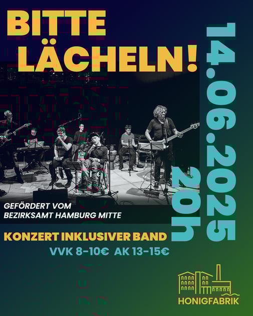 Da lächeln die Ohren! Herrliche Grooves, wunderbare Melodien und spritzige Texte. Wenn die Musiker der inklusiven Band BITTE LÄCHELN! ihre Instrumente auspacken und ihre Songs anstimmen, gibt ́s einen Crossover aus Reggae, Rock, Pop, Ska, Blues und Polka zu hören und eine absolut authentische Bühnenshow zu sehen. Im Gepäck haben die Herren ihr aktuelles Album„AUFBRUCHSTIMMUNG“...